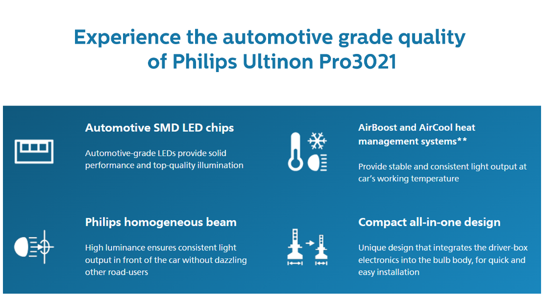 A new generation of headlight bulbs offering superior performance and durability at a pocket-friendly price, Philips Ultinon Pro3021 LED headlight bulbs. It offers brighter light and a cool-white-light look, compared to halogen bulbs.
